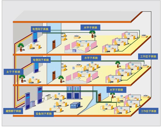 系统分为三大子系统,分别为工作区子系统、管理间子系统、以及设备间子系统,为二级星型拓扑结构。
