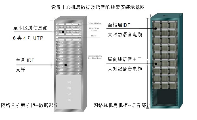 (5)楼层管理区均采用19”标准机柜,水平配线架采用模块化配线架,放置于标准机柜,连接水平线缆和网络设备;垂直主干配线架采用机架式光纤配线架,放置于标准机柜,连接垂直光纤和网络设备。