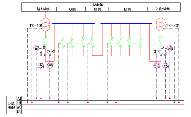 (三)、给排水系统 BAS系统根据大楼用水量的变化,及时调整系统中生活水泵的运行台数以达到供水量与需水量之间的平衡,实现泵房的运行,实现高效率、低能耗的化控制,从而达到经济运行的目的。 根据给排水的初步设计,所有潜水泵均可有磁性浮球液位控制器控制启停,消防水泵由消防系统单独控制,因此BAS系统对潜水排污泵和消防水泵只监视不控制。 (四)、供配电及能源管理系统 监控范围包括高低压配电柜、发电机及变压器等设备。BAS采用国际常用总线接口(采用Modbus协议或Canopn协议)与供配电系统相联,读取每个变配电箱的相关信息。 由于现代社会一直提倡节能的理念,BMS系统也会对大楼内的能源配置进行合理的优化和管理,首先体现在对电能的能源管理上。我们将在低压柜中安装一定数量的电力参数智能采集仪,采集实时电力参数,通过BMS系统主服务器对电能进行合理优化管理。
